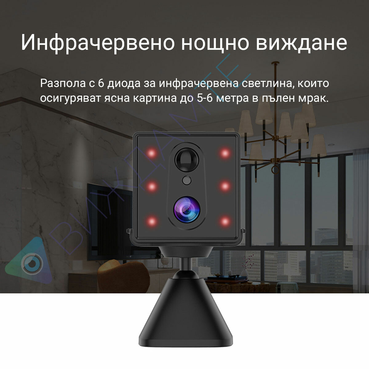 Камерата е оборудвана с инфрачервено (IR) нощно виждане. Когато се стъмни или загасите осветлението, камерата автоматично преминава в нощен режим (черно-бял) и ви позволява да виждате, дори и в пълен мрак.