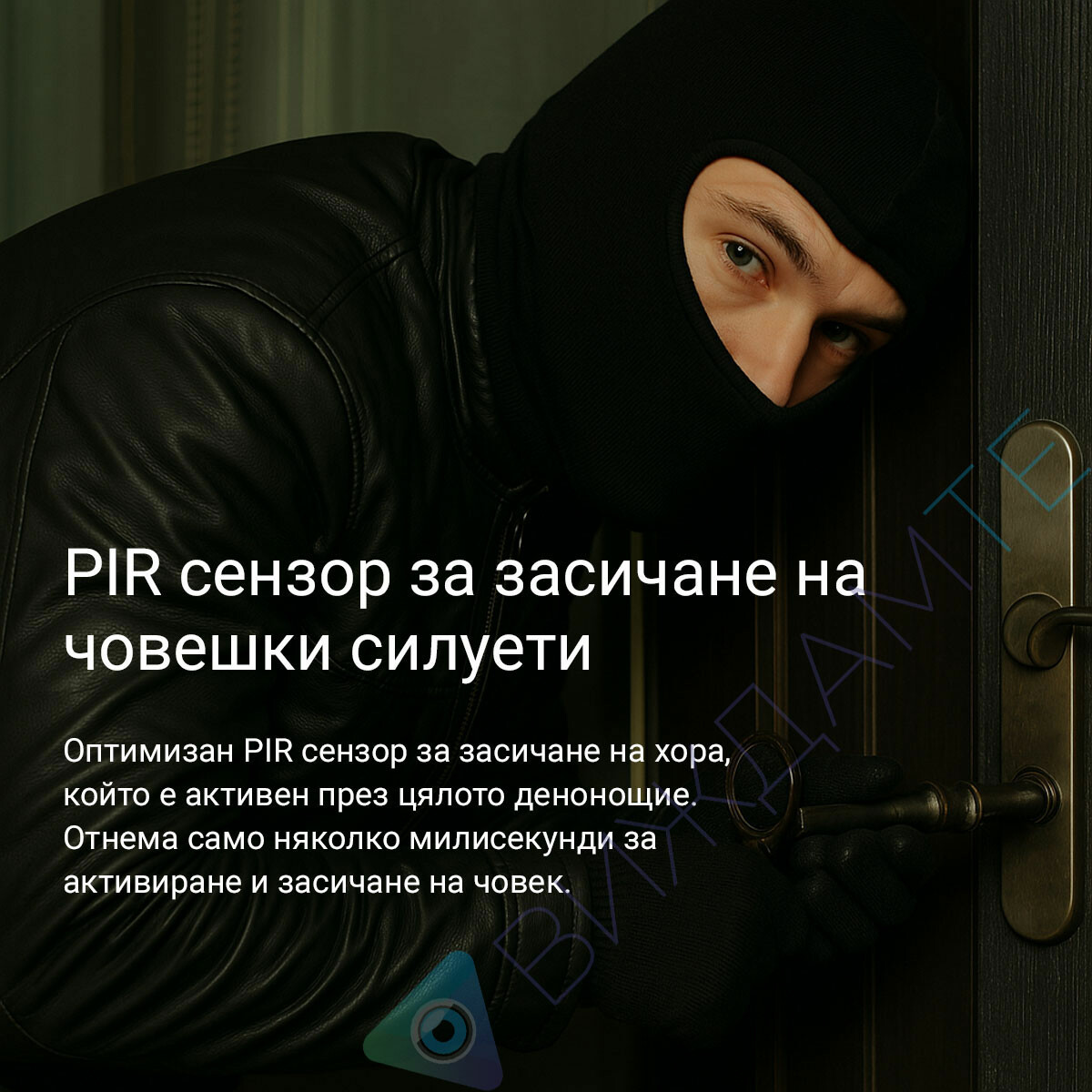 Пасивният PIR сензор има ефективен обхват на действие от 10 метра. Сензорът може да филтрира движение на живи обекти от други движещи се такива (например клатещи се клони или летящи торбички). Така, когато един неодушевен обект се движи - няма аларма, но когато усети движение на човешко тяло - се задейства аларма. Той също така управлява записите на камерата, като я стартира при засичане на движение (през останалото време камерата изпада в спящ режим за пестене на енергия).