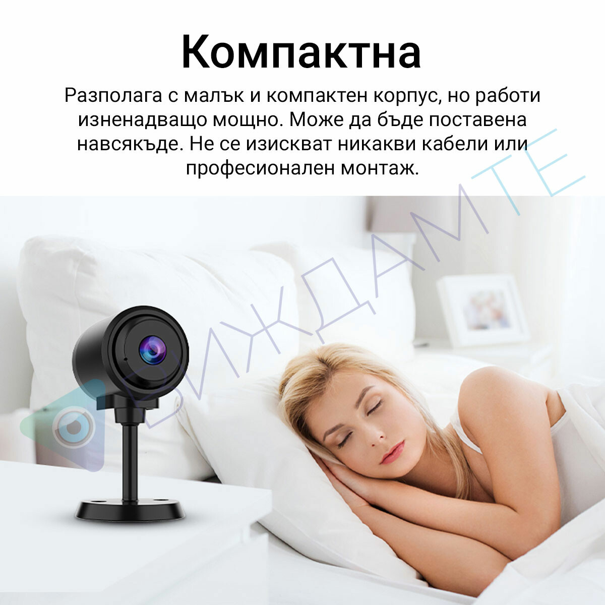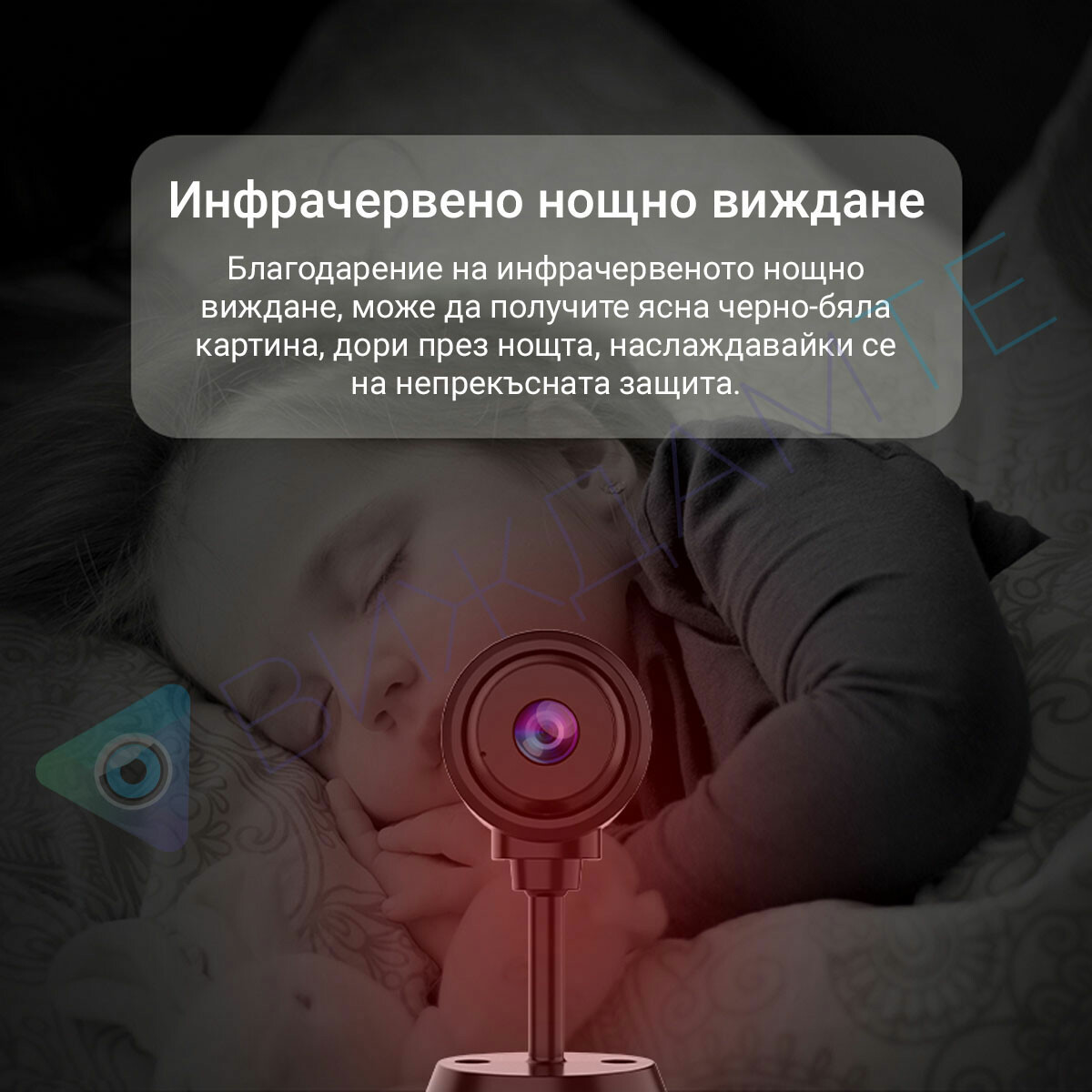 Камерата е оборудвана с инфрачервено (IR) нощно виждане. Когато се стъмни или загасите осветлението, камерата автоматично преминава в нощен режим (черно-бял) и ви позволява да виждате, дори и в пълен мрак.