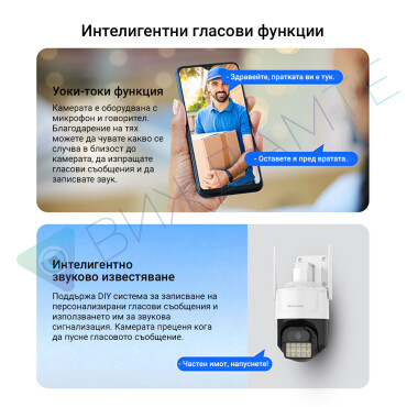 Камерата е оборудвана с микрофон и високоговорител. Благодарение на тях можете да чувате какво се случва в близост до камерата, да изпращате гласови съобщения и да записвате звук.