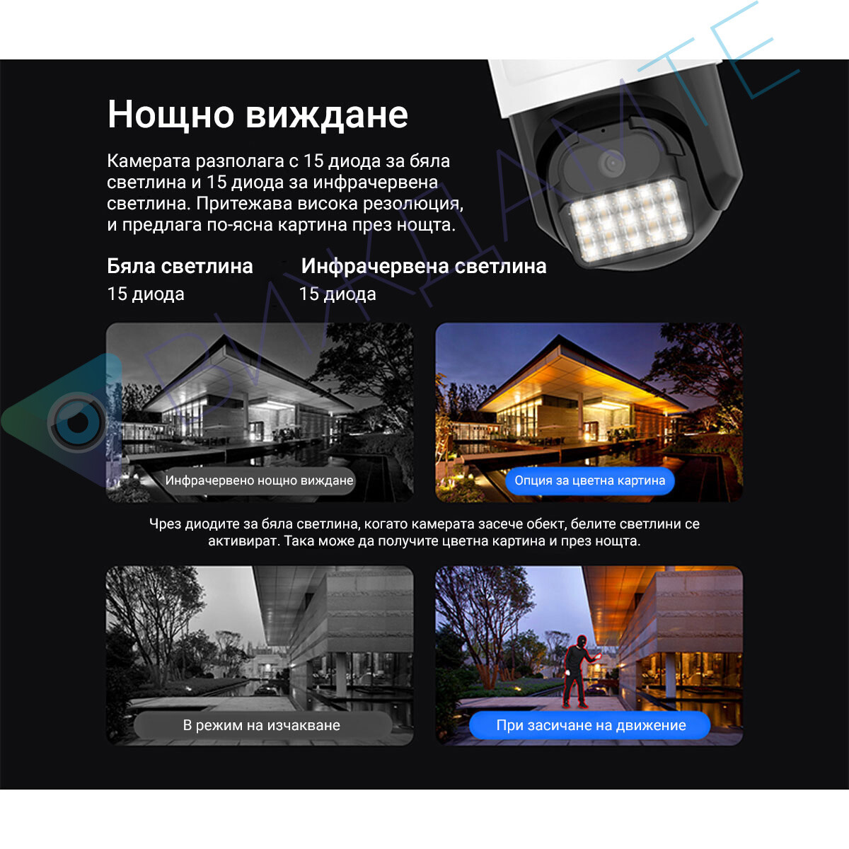 Камерата е оборудвана с инфрачервено (IR) нощно виждане. Когато се стъмни или загасите осветлението, камерата автоматично преминава в нощен режим (черно-бял) и ви позволява да виждате, дори и в пълен мрак.